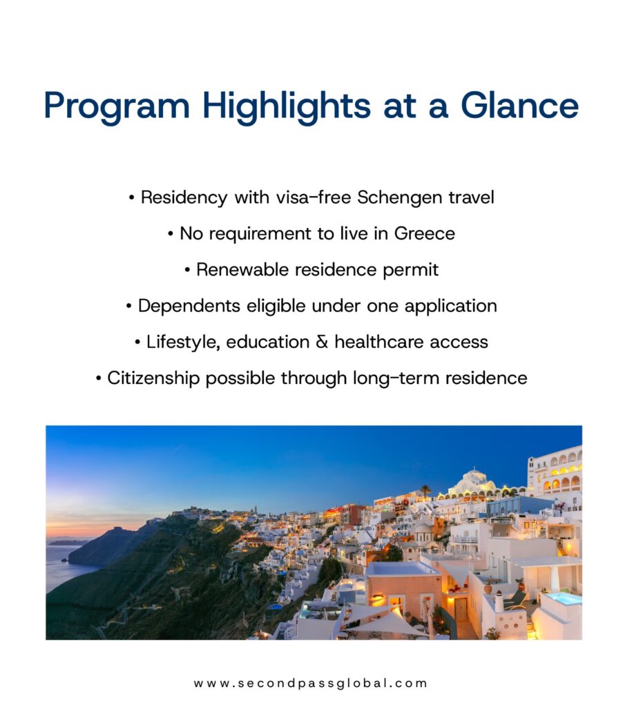 The process is fast, with residency typically granted within 2–3 months, and there is no requirement to live in Greece. One application can include the entire family, allowing dependents to benefit from European access and long-term stability. Over time, the program also opens a pathway toward citizenship through continued residence.