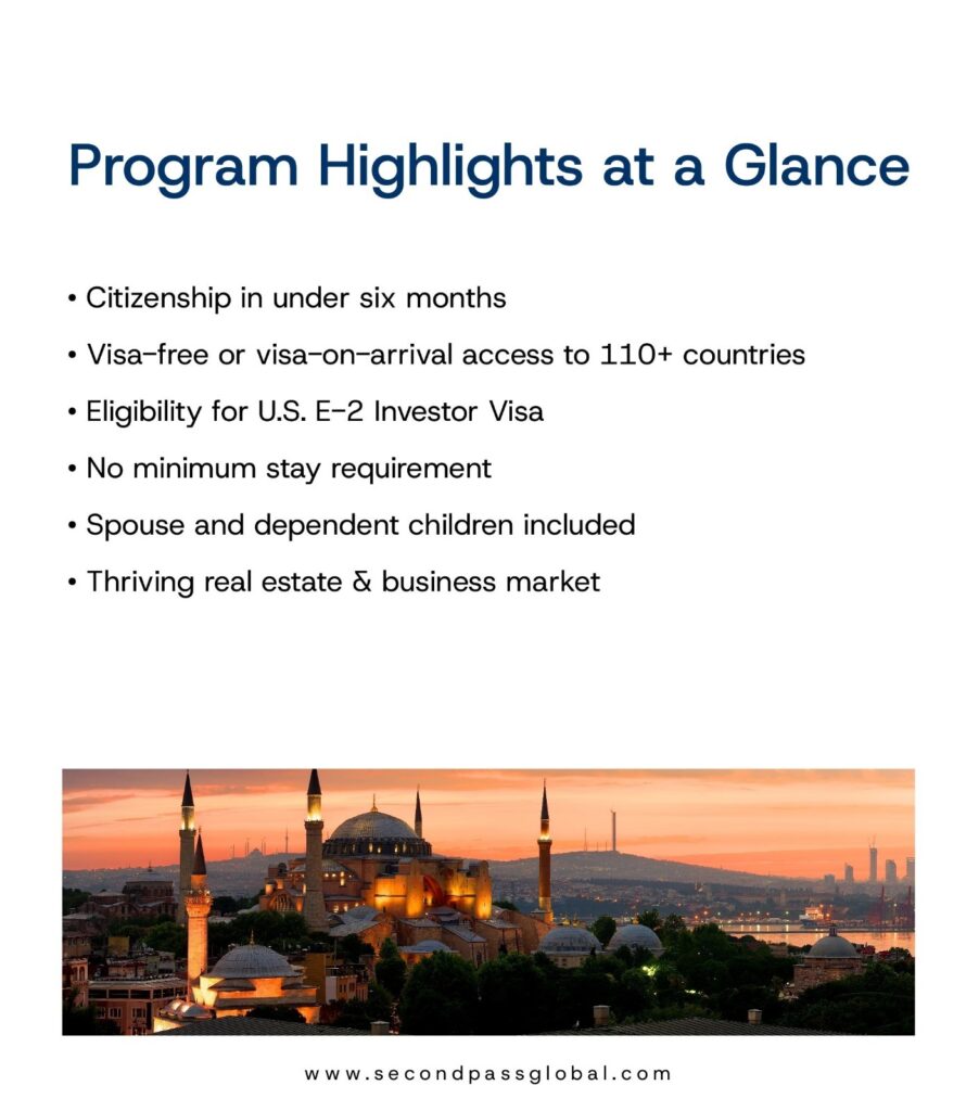 With the passport issued in just 4–6 months, this program offers a fast, efficient path to global mobility and financial opportunity. Turkey’s strategic location, vibrant culture, and robust property market make it an ideal choice for investors seeking both security and growth.